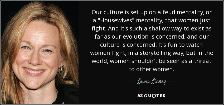 Our culture is set up on a feud mentality, or a "Housewives" mentality, that women just fight. And it's such a shallow way to exist as far as our evolution is concerned, and our culture is concerned. It's fun to watch women fight, in a storytelling way, but in the world, women shouldn't be seen as a threat to other women.