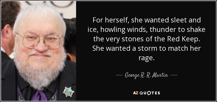 For herself, she wanted sleet and ice, howling winds, thunder to shake the very stones of the Red Keep. She wanted a storm to match her rage.