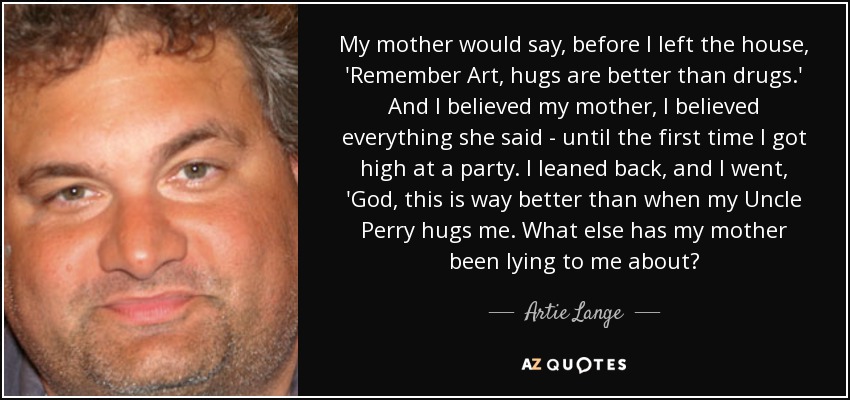 My mother would say, before I left the house, 'Remember Art, hugs are better than drugs.' And I believed my mother, I believed everything she said - until the first time I got high at a party. I leaned back, and I went, 'God, this is way better than when my Uncle Perry hugs me. What else has my mother been lying to me about?