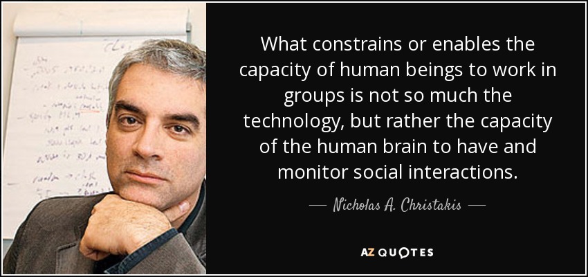 What constrains or enables the capacity of human beings to work in groups is not so much the technology, but rather the capacity of the human brain to have and monitor social interactions.