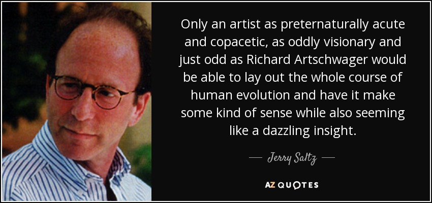 Only an artist as preternaturally acute and copacetic, as oddly visionary and just odd as Richard Artschwager would be able to lay out the whole course of human evolution and have it make some kind of sense while also seeming like a dazzling insight.