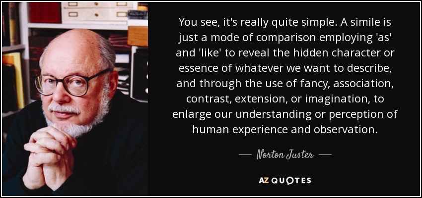 You see, it's really quite simple. A simile is just a mode of comparison employing 'as' and 'like' to reveal the hidden character or essence of whatever we want to describe, and through the use of fancy, association, contrast, extension, or imagination, to enlarge our understanding or perception of human experience and observation.