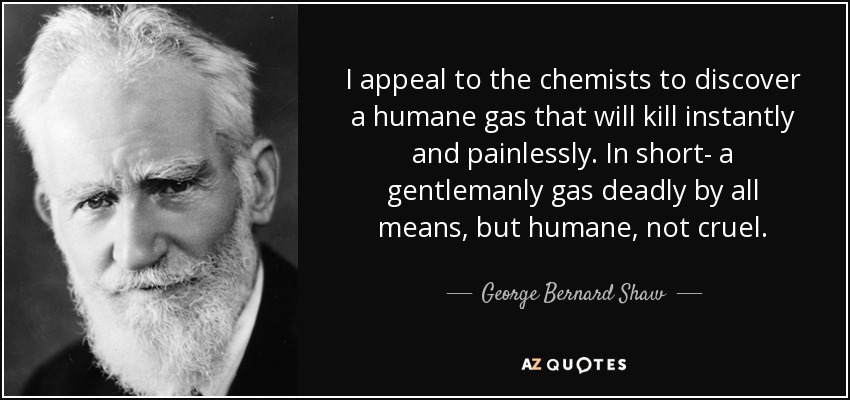 I appeal to the chemists to discover a humane gas that will kill instantly and painlessly. In short- a gentlemanly gas deadly by all means, but humane, not cruel.