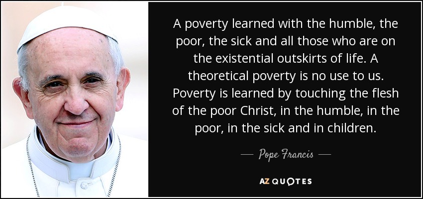 A poverty learned with the humble, the poor, the sick and all those who are on the existential outskirts of life. A theoretical poverty is no use to us. Poverty is learned by touching the flesh of the poor Christ, in the humble, in the poor, in the sick and in children.