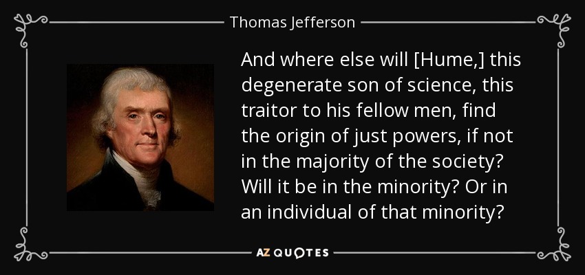 And where else will [Hume,] this degenerate son of science, this traitor to his fellow men, find the origin of just powers, if not in the majority of the society? Will it be in the minority? Or in an individual of that minority?