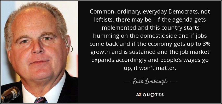 Common, ordinary, everyday Democrats, not leftists, there may be - if the agenda gets implemented and this country starts humming on the domestic side and if jobs come back and if the economy gets up to 3% growth and is sustained and the job market expands accordingly and people's wages go up, it won't matter.