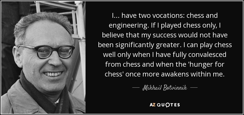 I ... have two vocations: chess and engineering. If I played chess only, I believe that my success would not have been significantly greater. I can play chess well only when I have fully convalesced from chess and when the 'hunger for chess' once more awakens within me.