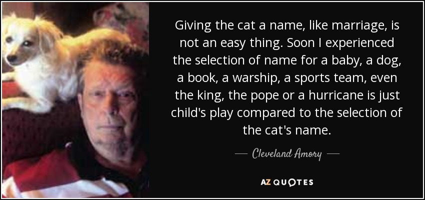 Giving the cat a name, like marriage, is not an easy thing. Soon I experienced the selection of name for a baby, a dog, a book, a warship, a sports team, even the king, the pope or a hurricane is just child's play compared to the selection of the cat's name.
