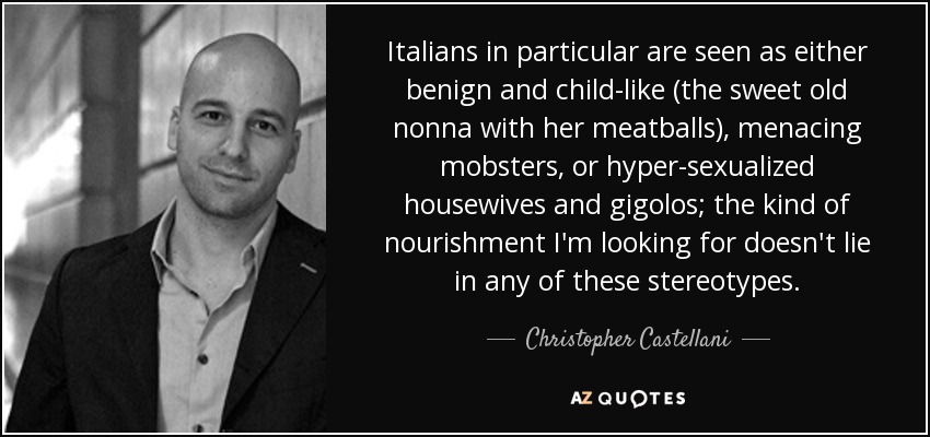 Italians in particular are seen as either benign and child-like (the sweet old nonna with her meatballs), menacing mobsters, or hyper-sexualized housewives and gigolos; the kind of nourishment I'm looking for doesn't lie in any of these stereotypes.