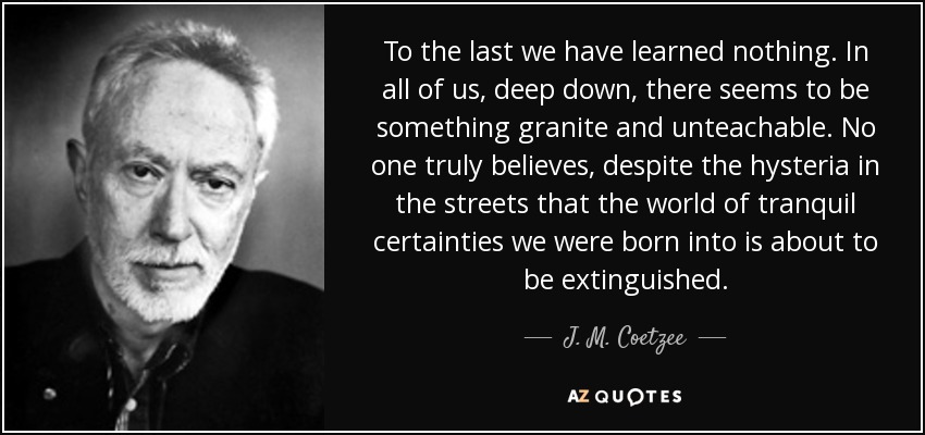 To the last we have learned nothing. In all of us, deep down, there seems to be something granite and unteachable. No one truly believes, despite the hysteria in the streets that the world of tranquil certainties we were born into is about to be extinguished.