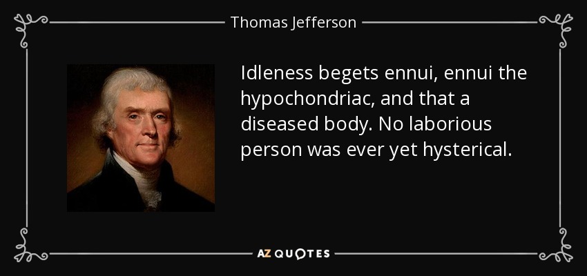 Idleness begets ennui, ennui the hypochondriac, and that a diseased body. No laborious person was ever yet hysterical.