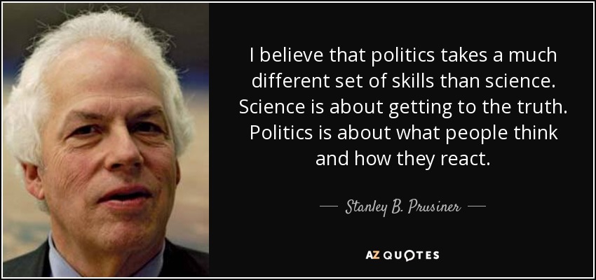 I believe that politics takes a much different set of skills than science. Science is about getting to the truth. Politics is about what people think and how they react.