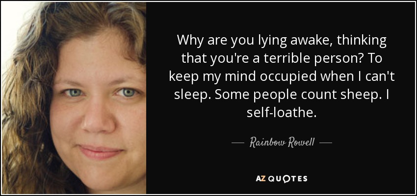 Why are you lying awake, thinking that you're a terrible person? To keep my mind occupied when I can't sleep. Some people count sheep. I self-loathe.