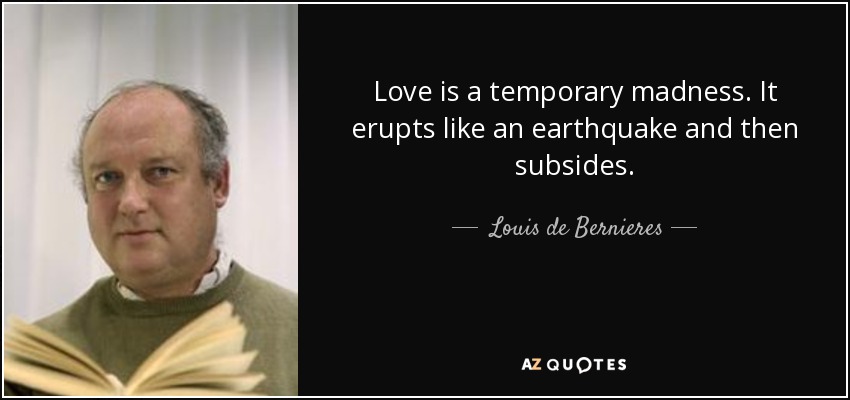 Love is a temporary madness. It erupts like an earthquake and then subsides. And when it subsides you have to make a decision. You have to work out whether your roots have become so entwined together that it is inconceivable that you should ever part. Because this is what love is. Love is not breathlessness, it is not excitement, it is not the promulgation of promises of eternal passion. That is just being in love which any of us can convince ourselves we are. Love itself is what is left over when being in love has burned away, and this is both an art and a fortunate accident.