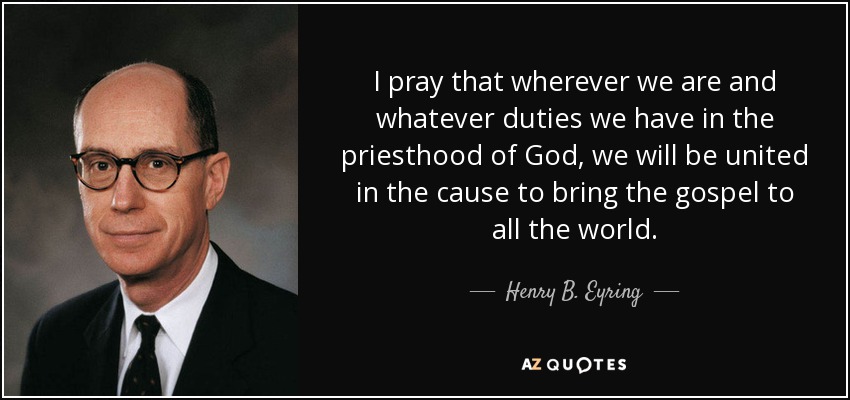 I pray that wherever we are and whatever duties we have in the priesthood of God, we will be united in the cause to bring the gospel to all the world.