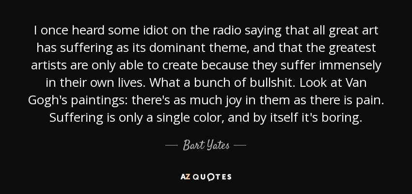 I once heard some idiot on the radio saying that all great art has suffering as its dominant theme, and that the greatest artists are only able to create because they suffer immensely in their own lives. What a bunch of bullshit. Look at Van Gogh's paintings: there's as much joy in them as there is pain. Suffering is only a single color, and by itself it's boring.