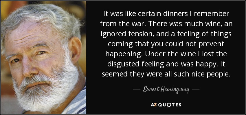 It was like certain dinners I remember from the war. There was much wine, an ignored tension, and a feeling of things coming that you could not prevent happening. Under the wine I lost the disgusted feeling and was happy. It seemed they were all such nice people.