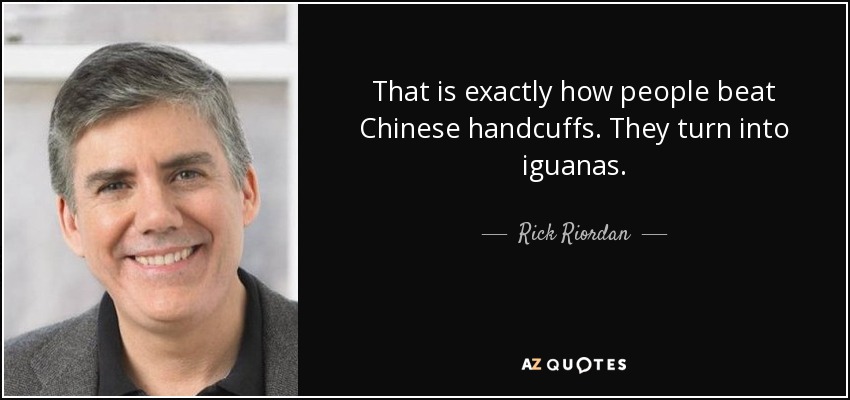 Frank tugged again with no luck. Even Hazel was trying not to laugh. Frank grimaced with concentration. Suddenly, he disappeared. On the deck where he’d been standing, a green iguana crouched next to an empty set of Chinese handcuffs. “Well done, Frank Zhang,” Leo said dryly, doing his impression of Chiron the centaur. “That is exactly how people beat Chinese handcuffs. They turn into iguanas.
