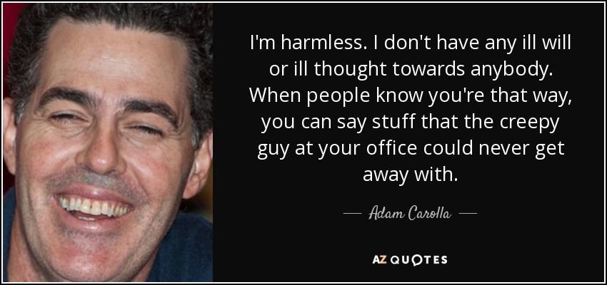 I'm harmless. I don't have any ill will or ill thought towards anybody. When people know you're that way, you can say stuff that the creepy guy at your office could never get away with.