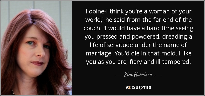 I opine-I think you're a woman of your world,' he said from the far end of the couch. 'I would have a hard time seeing you pressed and powdered, dreading a life of servitude under the name of marriage. You'd die in that mold. I like you as you are, fiery and ill tempered.
