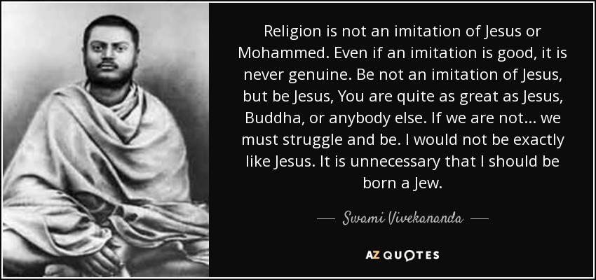 Religion is not an imitation of Jesus or Mohammed. Even if an imitation is good, it is never genuine. Be not an imitation of Jesus, but be Jesus, You are quite as great as Jesus, Buddha, or anybody else. If we are not ... we must struggle and be. I would not be exactly like Jesus. It is unnecessary that I should be born a Jew.