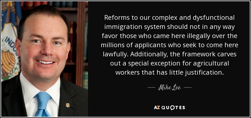Reforms to our complex and dysfunctional immigration system should not in any way favor those who came here illegally over the millions of applicants who seek to come here lawfully. Additionally, the framework carves out a special exception for agricultural workers that has little justification.