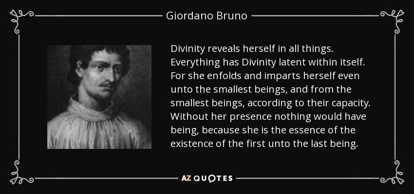 Divinity reveals herself in all things. Everything has Divinity latent within itself. For she enfolds and imparts herself even unto the smallest beings, and from the smallest beings, according to their capacity. Without her presence nothing would have being, because she is the essence of the existence of the first unto the last being.