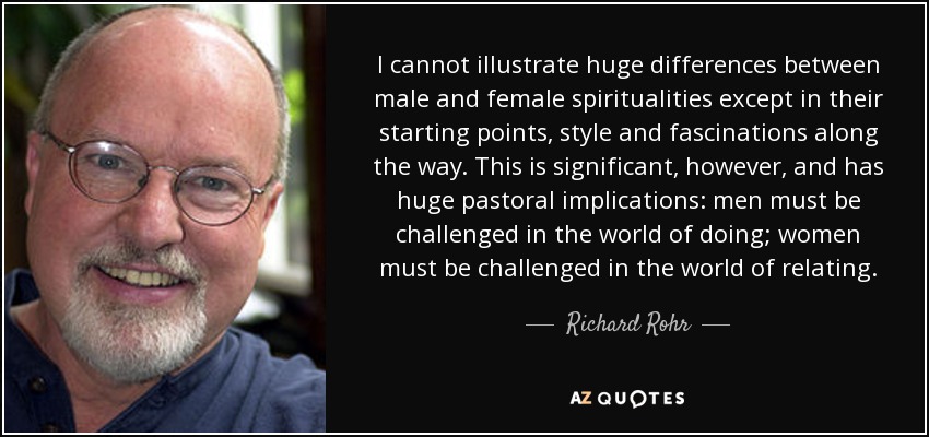 I cannot illustrate huge differences between male and female spiritualities except in their starting points, style and fascinations along the way. This is significant, however, and has huge pastoral implications: men must be challenged in the world of doing; women must be challenged in the world of relating.