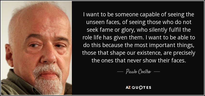 I want to be someone capable of seeing the unseen faces, of seeing those who do not seek fame or glory, who silently fulfil the role life has given them. I want to be able to do this because the most important things, those that shape our existence, are precisely the ones that never show their faces.