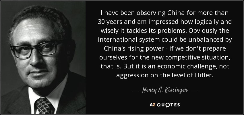 I have been observing China for more than 30 years and am impressed how logically and wisely it tackles its problems. Obviously the international system could be unbalanced by China's rising power - if we don't prepare ourselves for the new competitive situation, that is. But it is an economic challenge, not aggression on the level of Hitler.