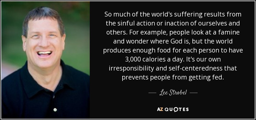 So much of the world's suffering results from the sinful action or inaction of ourselves and others. For example, people look at a famine and wonder where God is, but the world produces enough food for each person to have 3,000 calories a day. It's our own irresponsibility and self-centeredness that prevents people from getting fed.