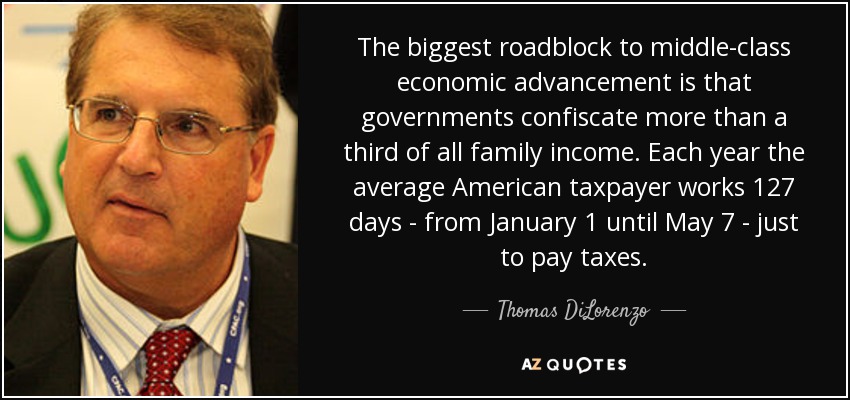 The biggest roadblock to middle-class economic advancement is that governments confiscate more than a third of all family income. Each year the average American taxpayer works 127 days - from January 1 until May 7 - just to pay taxes.