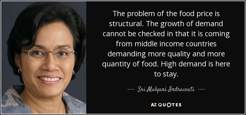 The problem of the food price is structural. The growth of demand cannot be checked in that it is coming from middle income countries demanding more quality and more quantity of food. High demand is here to stay.