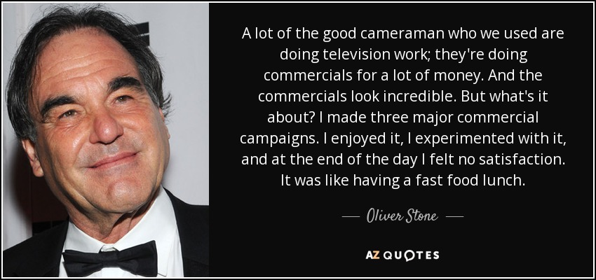 A lot of the good cameraman who we used are doing television work; they're doing commercials for a lot of money. And the commercials look incredible. But what's it about? I made three major commercial campaigns. I enjoyed it, I experimented with it, and at the end of the day I felt no satisfaction. It was like having a fast food lunch.