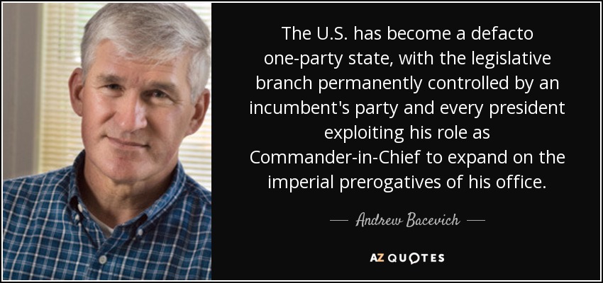 The U.S. has become a defacto one-party state, with the legislative branch permanently controlled by an incumbent's party and every president exploiting his role as Commander-in-Chief to expand on the imperial prerogatives of his office.