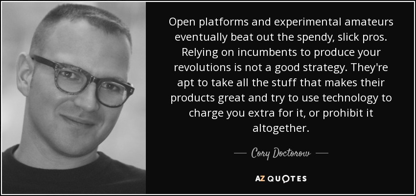Open platforms and experimental amateurs eventually beat out the spendy, slick pros. Relying on incumbents to produce your revolutions is not a good strategy. They're apt to take all the stuff that makes their products great and try to use technology to charge you extra for it, or prohibit it altogether.