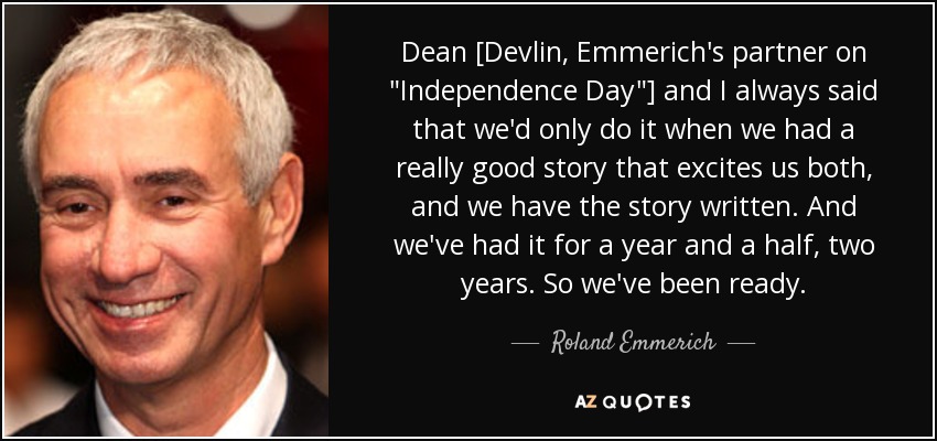 Dean [Devlin, Emmerich's partner on "Independence Day"] and I always said that we'd only do it when we had a really good story that excites us both, and we have the story written. And we've had it for a year and a half, two years. So we've been ready.