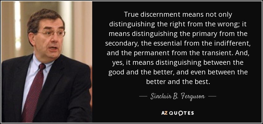 True discernment means not only distinguishing the right from the wrong; it means distinguishing the primary from the secondary, the essential from the indifferent, and the permanent from the transient. And, yes, it means distinguishing between the good and the better, and even between the better and the best.