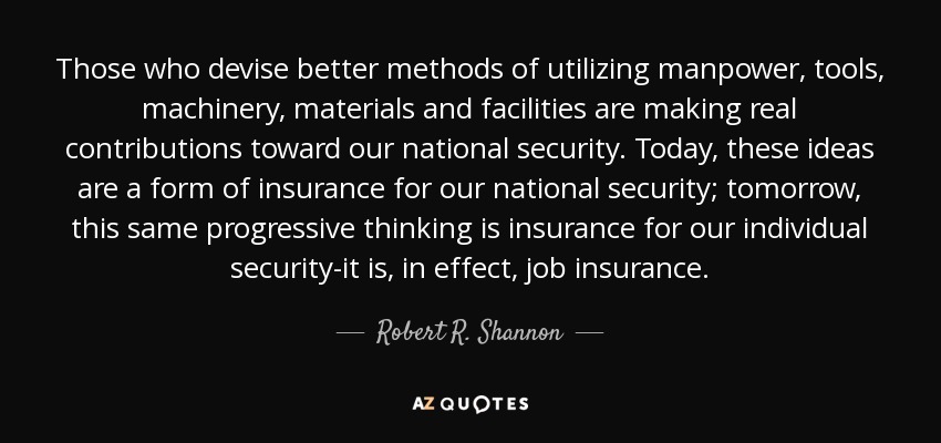 Those who devise better methods of utilizing manpower, tools, machinery, materials and facilities are making real contributions toward our national security. Today, these ideas are a form of insurance for our national security; tomorrow, this same progressive thinking is insurance for our individual security-it is, in effect, job insurance.