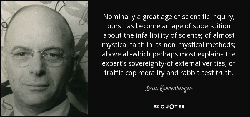 Nominally a great age of scientific inquiry, ours has become an age of superstition about the infallibility of science; of almost mystical faith in its non-mystical methods; above all-which perhaps most explains the expert's sovereignty-of external verities; of traffic-cop morality and rabbit-test truth.