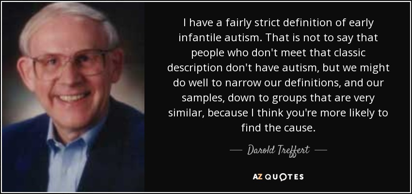 I have a fairly strict definition of early infantile autism. That is not to say that people who don't meet that classic description don't have autism, but we might do well to narrow our definitions, and our samples, down to groups that are very similar, because I think you're more likely to find the cause.