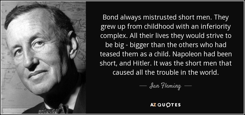 Bond always mistrusted short men. They grew up from childhood with an inferiority complex. All their lives they would strive to be big - bigger than the others who had teased them as a child. Napoleon had been short, and Hitler. It was the short men that caused all the trouble in the world.