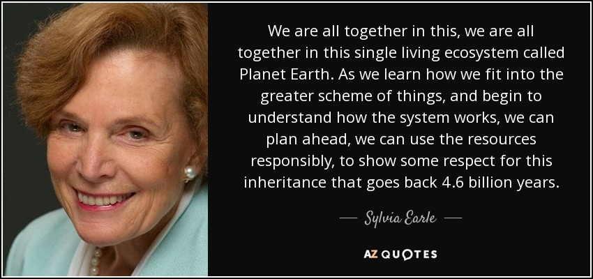 We are all together in this, we are all together in this single living ecosystem called Planet Earth. As we learn how we fit into the greater scheme of things, and begin to understand how the system works, we can plan ahead, we can use the resources responsibly, to show some respect for this inheritance that goes back 4.6 billion years.