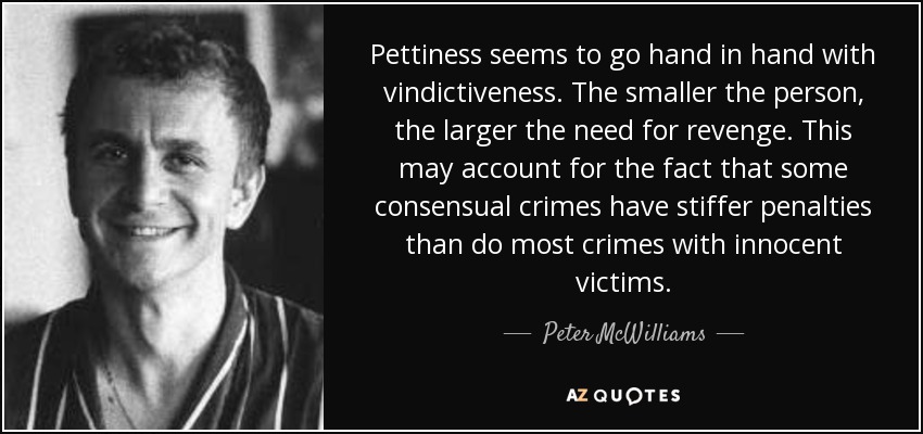 Pettiness seems to go hand in hand with vindictiveness. The smaller the person, the larger the need for revenge. This may account for the fact that some consensual crimes have stiffer penalties than do most crimes with innocent victims.
