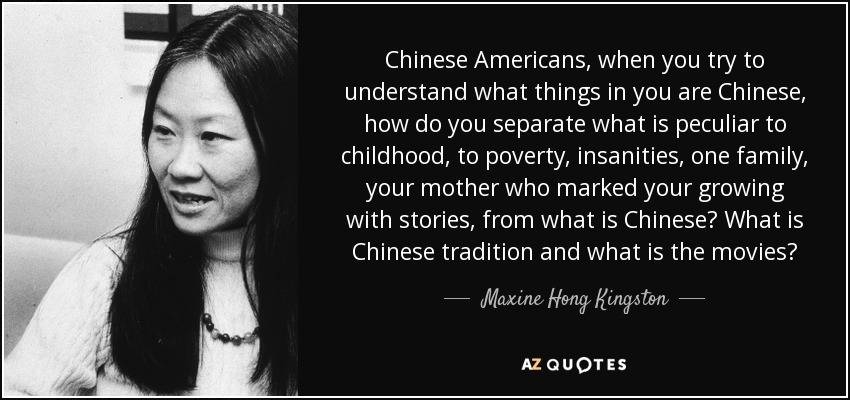 Chinese Americans, when you try to understand what things in you are Chinese, how do you separate what is peculiar to childhood, to poverty, insanities, one family, your mother who marked your growing with stories, from what is Chinese? What is Chinese tradition and what is the movies?