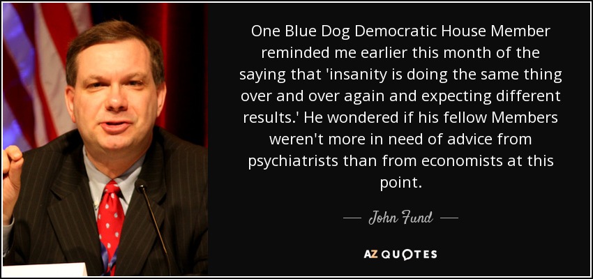 One Blue Dog Democratic House Member reminded me earlier this month of the saying that 'insanity is doing the same thing over and over again and expecting different results.' He wondered if his fellow Members weren't more in need of advice from psychiatrists than from economists at this point.