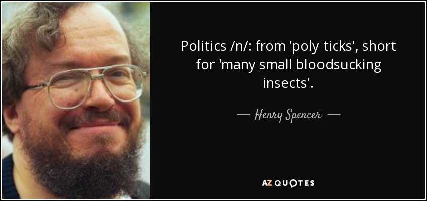Politics /n/: from 'poly ticks', short for 'many small bloodsucking insects'.
