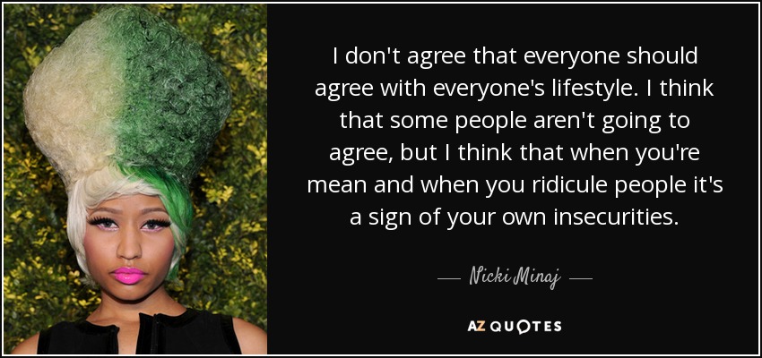 I don't agree that everyone should agree with everyone's lifestyle. I think that some people aren't going to agree, but I think that when you're mean and when you ridicule people it's a sign of your own insecurities.