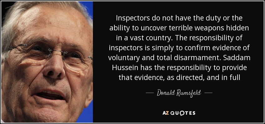 Inspectors do not have the duty or the ability to uncover terrible weapons hidden in a vast country. The responsibility of inspectors is simply to confirm evidence of voluntary and total disarmament. Saddam Hussein has the responsibility to provide that evidence, as directed, and in full