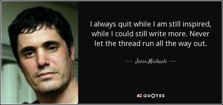 I always quit while I am still inspired, while I could still write more. Never let the thread run all the way out.